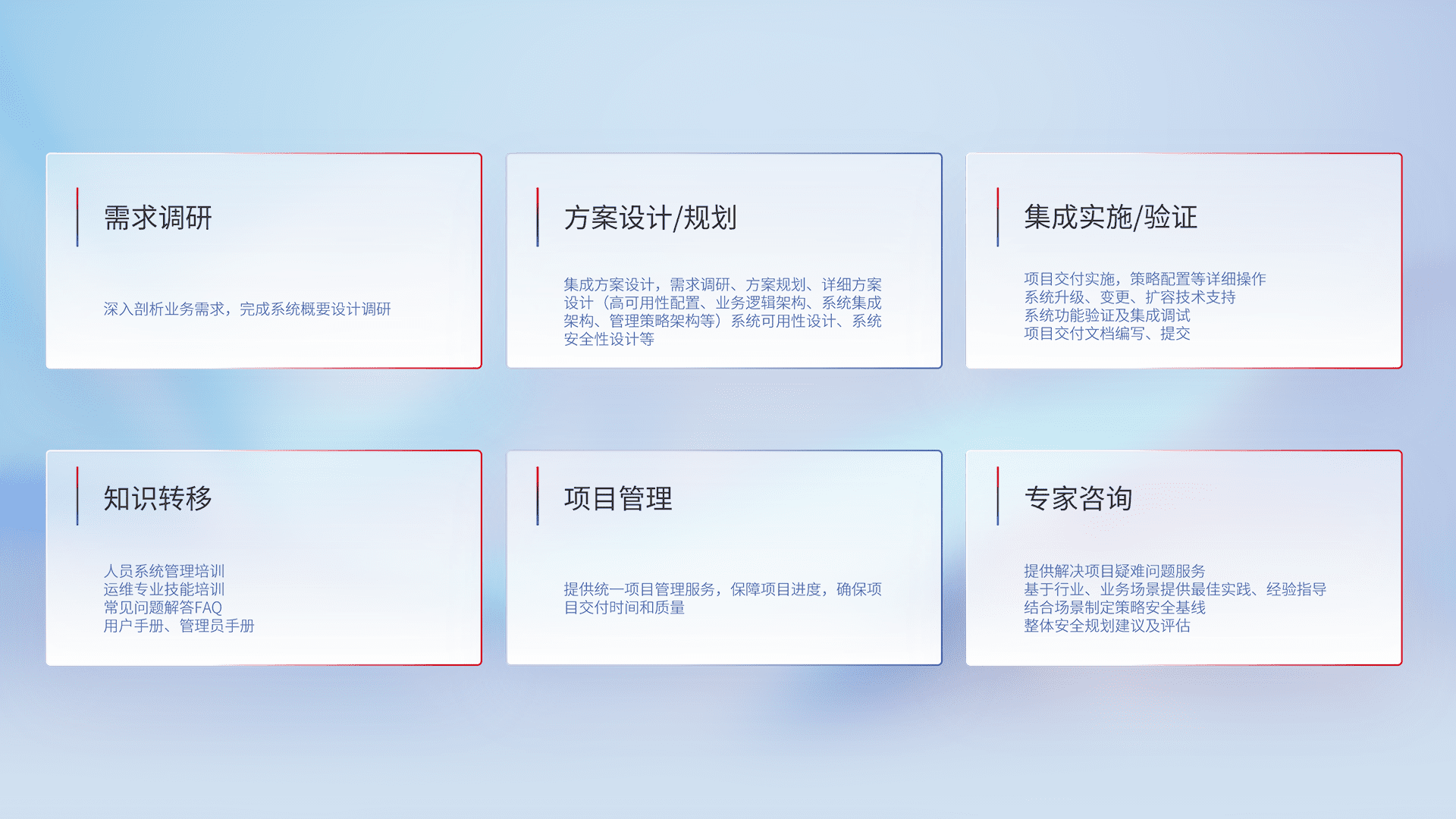 针对客户行业特性,,,,将宏观的安全战略和需求,,通过专业的交付服务,,,实现项目落地,,,为客户提供标准规范的集成交付服务。。